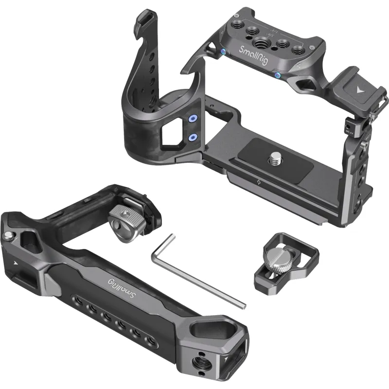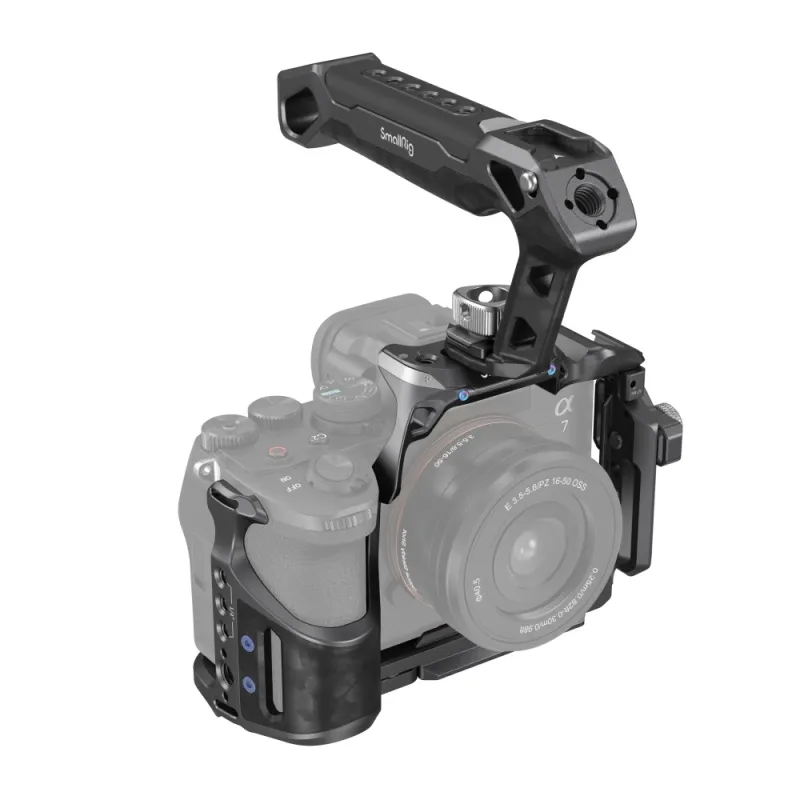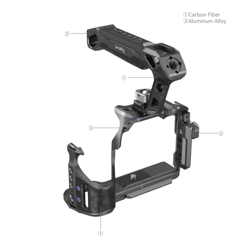 SmallRig "Rhinoceros" Basic Cage Kit for Sony Alpha 7R V / Alpha 7 IV / Alpha 7S III 3708 is designed to facilitate low-angle shooting, protect the camera, and provide accessory mounting points. The kit includes a cage, a top handle, and an HDMI cable clamp. Both the cage and the top handle are portable for being made of lighter carbon fiber, hence longer handheld shooting. For the cage, a locating pin, a 1/4"-20 screw, and an M2.5 screw together lock the camera firmly. It features a clean streamlined design that gives full access to the top buttons.