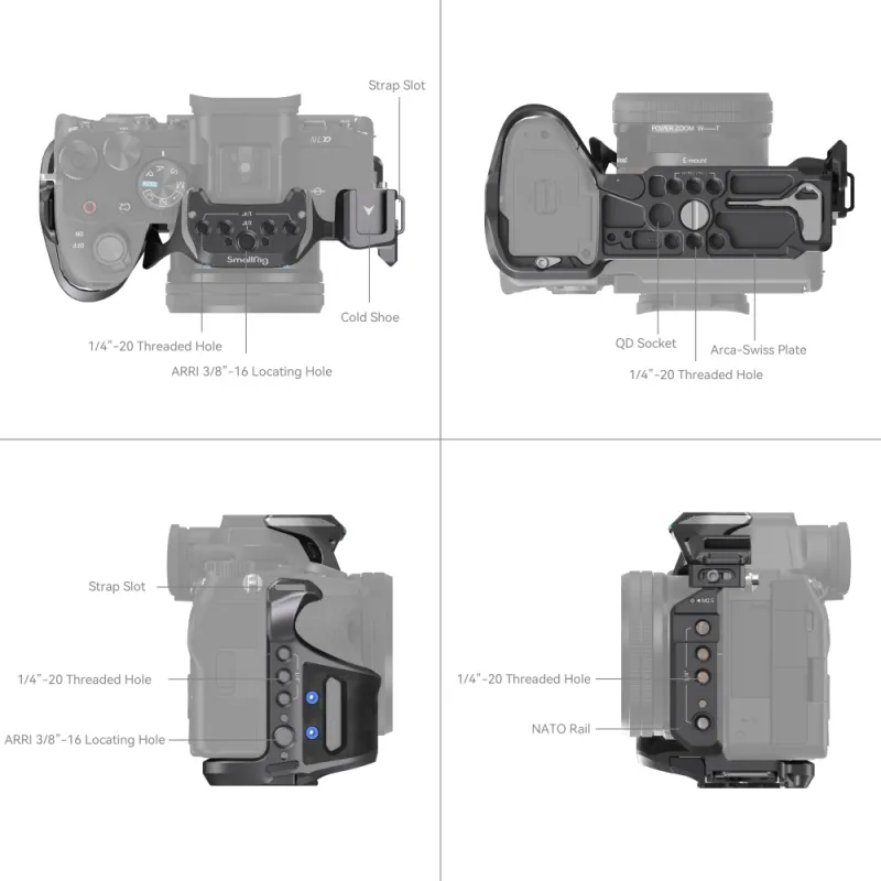 4. Multiple accessory mounting points: 1/4"-20 threaded holes, ARRI 3/8"-16 locating holes, cold shoe mount, NATO rail, QD socket for attaching the handle, microphone, LED video light, monitor, etc.