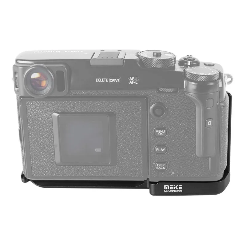 The Meike MK-PRO3G Metal Hand Grip Bracket has an all-metal base that attaches to the bottom of your camera. It increases the bottom weight and dampens vibrations. The leather handle provides a comfortable grip. This grip is designed for Fujifilm X-Pro3 system cameras.