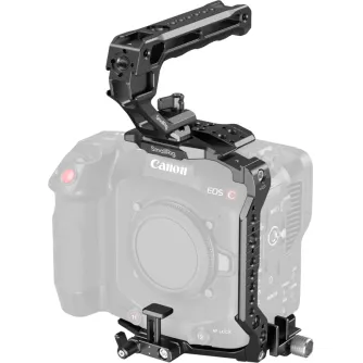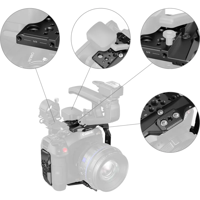 This cage kit is compatible with Canons original microphone mounts, focus plane markings, and external camera shoe cables (OC-E4A). The lens adapter support is adjustable by 19mm to accommodate various lens adapters, reducing strain on the camera mount to prevent deformation or damage.