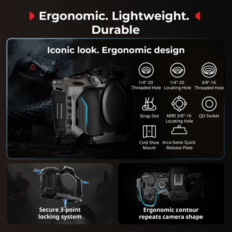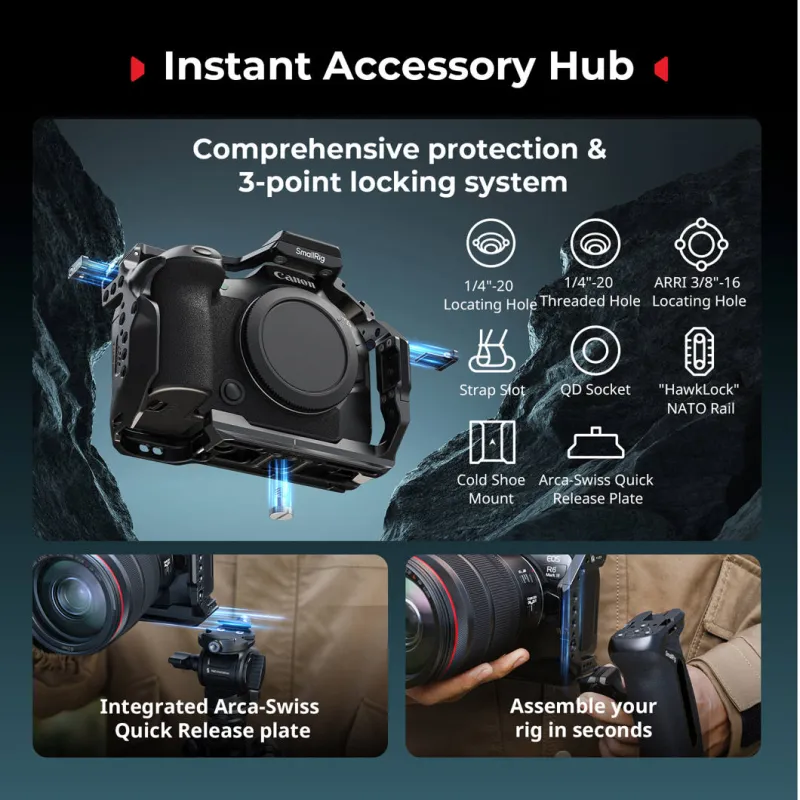 Sukurtas apsaugoti jūsų Canon EOS R6 Mark III, R6 Mark II ar R5 Mark II, tuo pačiu plečiant priedų palaikymą, SmallRig pažangus kameros narvas padeda apsaugoti nuo smūgių ir įbrėžimų naudojimo metu. Patikima trijų taškų užrakinimo sistema tvirtina kamerą naudojant ketvirtį dvidešimt varžtą kartu su dviem šoninėmis vietomis, kad būtų išvengta sukimų.