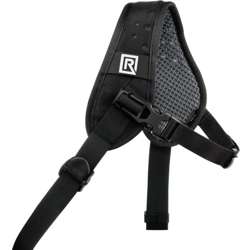 The Curve Breathe further stabilizes the attached camera when used with its included BlackRapid Brad Breathe Stabilizing Strap. The Brad Breathe secures this strap under the user's left shoulder and prevents the attached camera from twisting as it rests along one's right side. When camera movement along the side is less of a concern, the Brad Breathe is easy to remove.