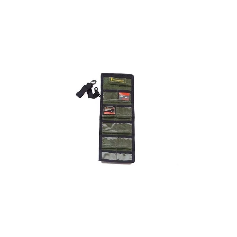 De houder is gemaakt van groene microsuède, hetzelfde materiaal als veel van onze kleding en de beroemde beanbags van Stealth Gear, en bevat 10 vakjes voor geheugenkaarten.