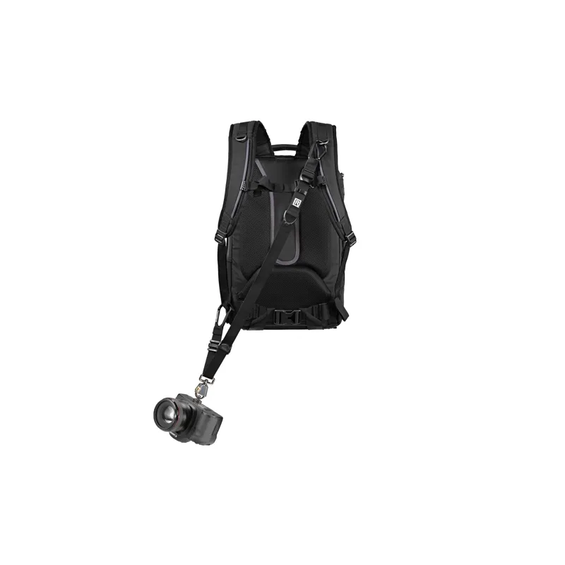 The Backpack Breathe Camera Strap from BlackRapid is designed for use with backpacks with two straps, allowing it to be attached to the shoulder strap on one side and the hip strap on the other side of the user. This allows the attached camera to be worn upside down on the hip.