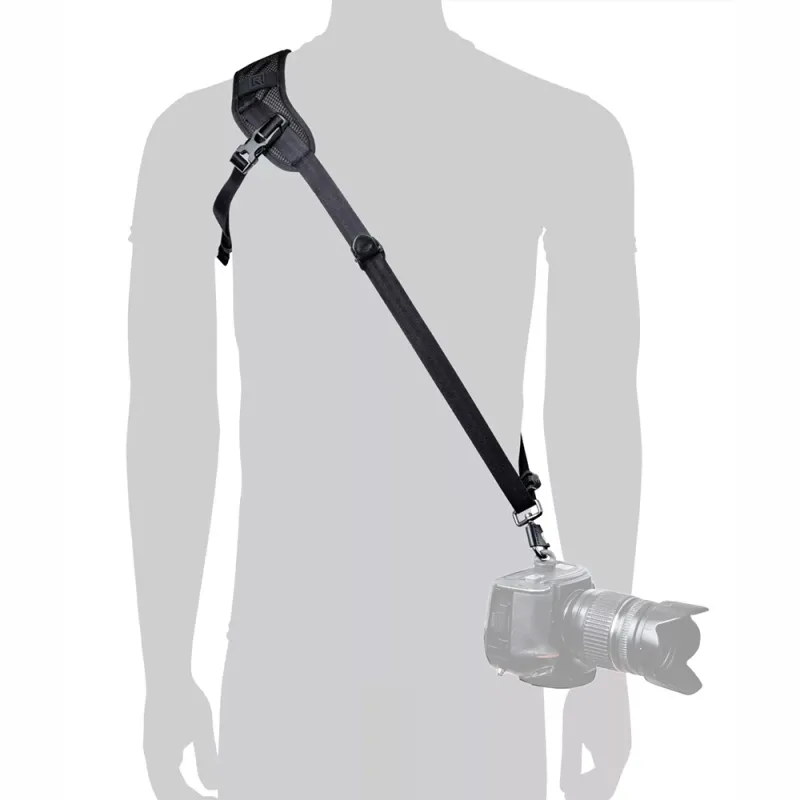 The sling is designed to be worn crosswise on the left shoulder with the camera on the right hip. The front and rear spring-loaded Cam Locks on the strap help secure the camera at the hip. It features a lockable carabiner ConnectR CR 3, and the stabilizer under the arm reduces slipping of the belt, locks in place, and is fully removable. The shoulder pad consists of highly breathable polyester mesh, TPE foam (thermoplastic elastomer), and polyester air mesh so you enjoy extra comfort.