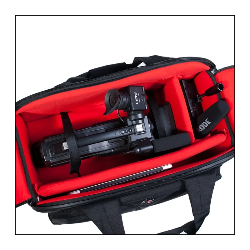 The main compartment can be opened and closed with the double zip and Velcro closure. It is divided in three sections, but has small pockets on the side for cables or a small laptop. The dividers and two extra straps for reinforcement so you can adjust the layout to your own wishes. Your equipment is easy to find in the bag thanks to the red lining.