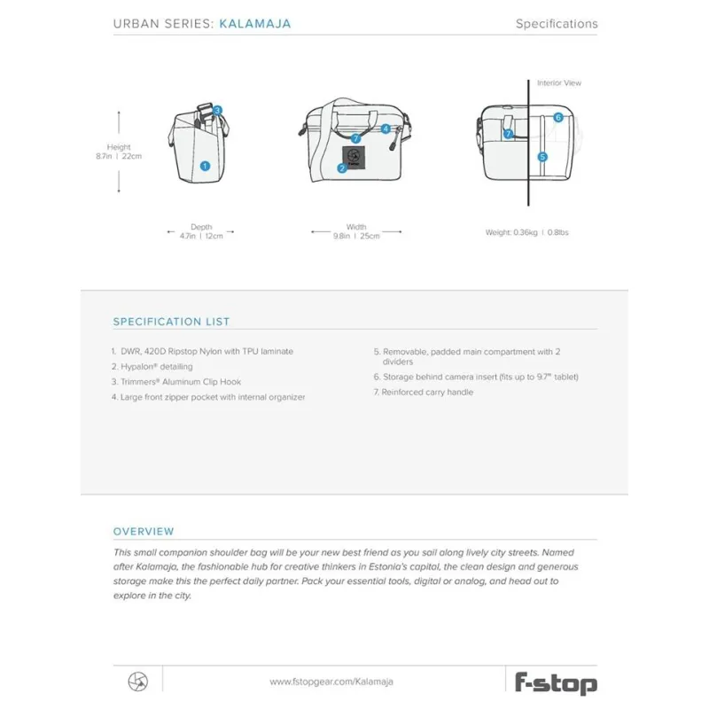 F-Stop Kalamaja Nasturtium (Orange) The F-Stop Kalamaja shoulder bag is a light, but robust camera bag. The Kalamaja is suitable for a compact camera and accessories or a system camera, with a lens or a flash. You can store an 11-inch tablet in a separate compartment.