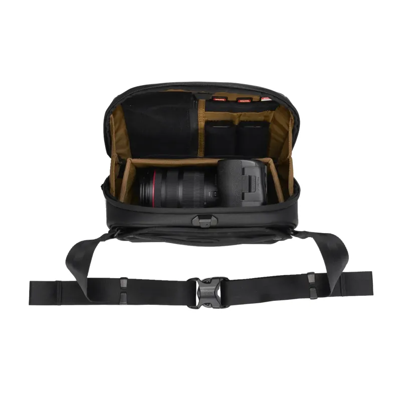 Its slim enough to be worn as a hip pack or over your shoulder as a sling, making this a compact, quick-to-the-draw camera sling. We built the opening with a rigid wireframe construction for quick one-handed access and full visibility. The quick-latching system opens and closes easily and keeps your valuable gear secure.