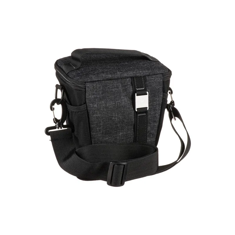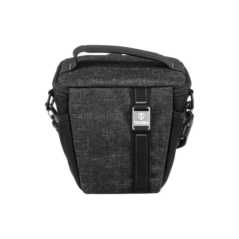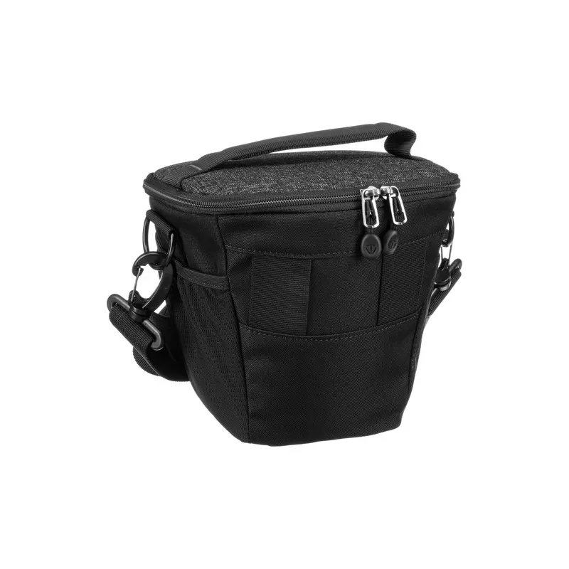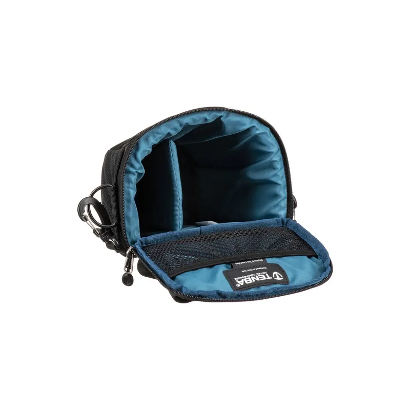 The Tenba Skyline 8 Top Load in black is made from water-repellent polyester and has durable reinforced stitching for long-term use. A mirrorless or Compact DSLR camera can sit comfortably inside, and the bag's top flap closes securely with a nylon YKK zipper to keep water, dust, and debris out. One interior and two exterior mesh pockets hold memory cards or a small water bottle. Carry the bag with the top handle, the included shoulder strap, or the two-loop belt attachment.