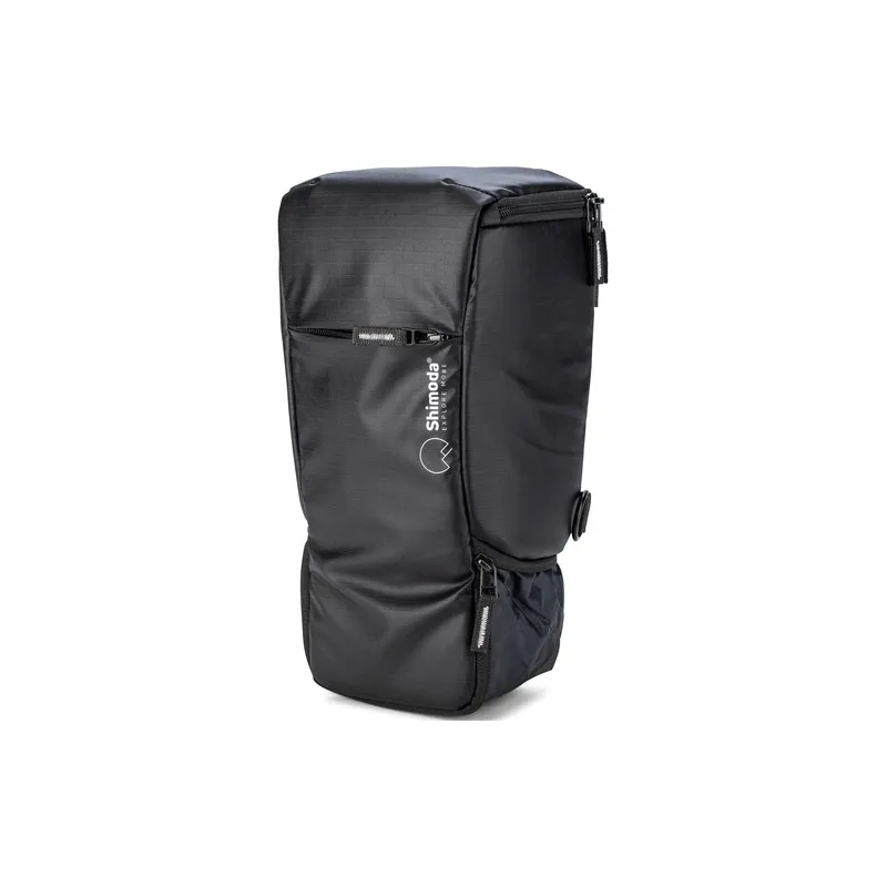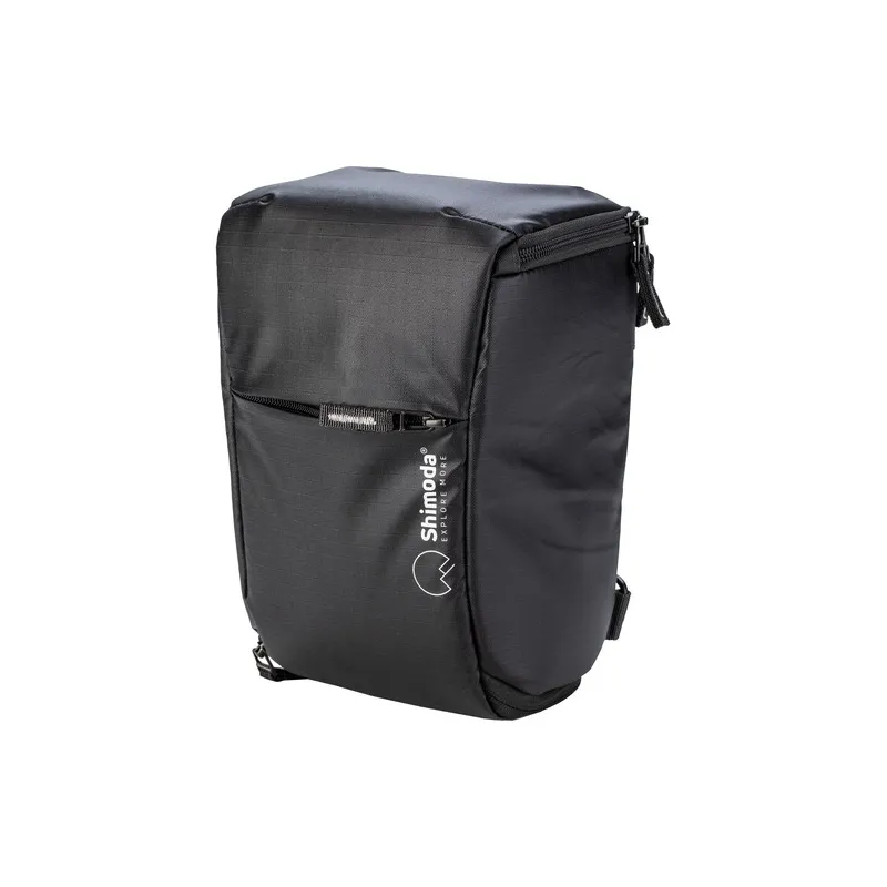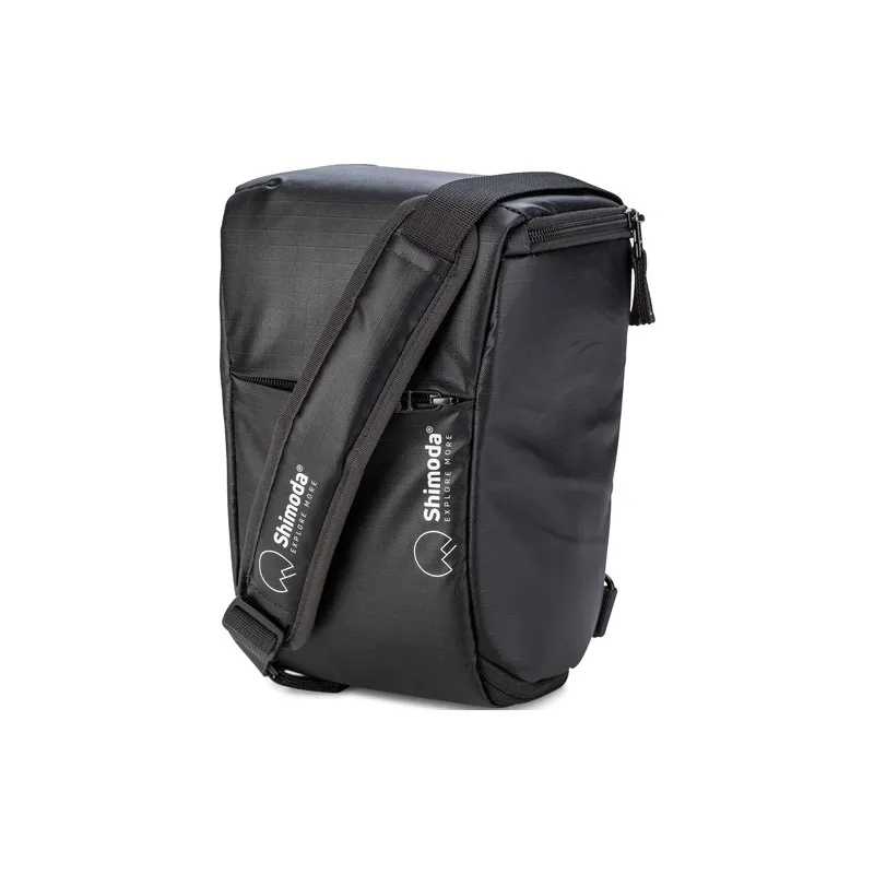 The Top Loader includes a variety of built-in carrying options, including a top handle, a shoulder strap, and a belt loop. Using two pairs of separately available Shimoda Designs Accessory Webbing Straps, the Top Loader features the ability to be mounted onto the backpack straps of a separately available Shimoda Designs Action X30, X50, or X70 backpack for use as a chest harness. The Top Loader can also be looped onto the detachable waist belt of an Action X30, X50, or X70 backpack. When used only with the detachable waist belt, the Top Loader functions as a lightweight day bag.