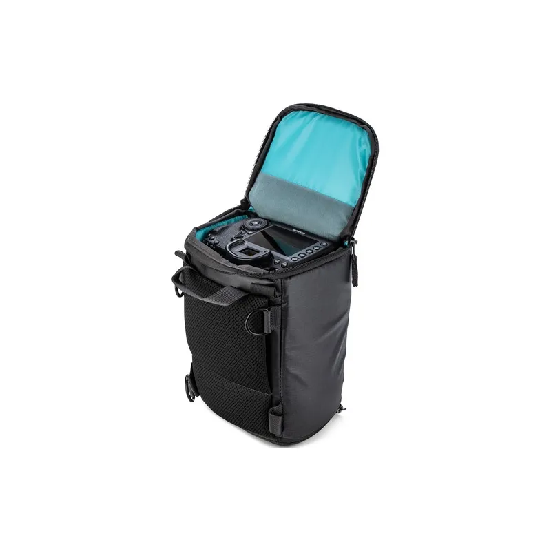 This black Shimoda Designs Top Loader is a versatile, multiuse holster case that can accommodate a medium-sized DSLR or mirrorless camera with an attached 24-70mm f/2.8 lens. Alternatively, the Top Loader can expand to accommodate a medium-sized DSLR or mirrorless camera with an attached 70-200mm f/2.8 lens, and a removable divider allows this holster case to be configured for a small drone kit.