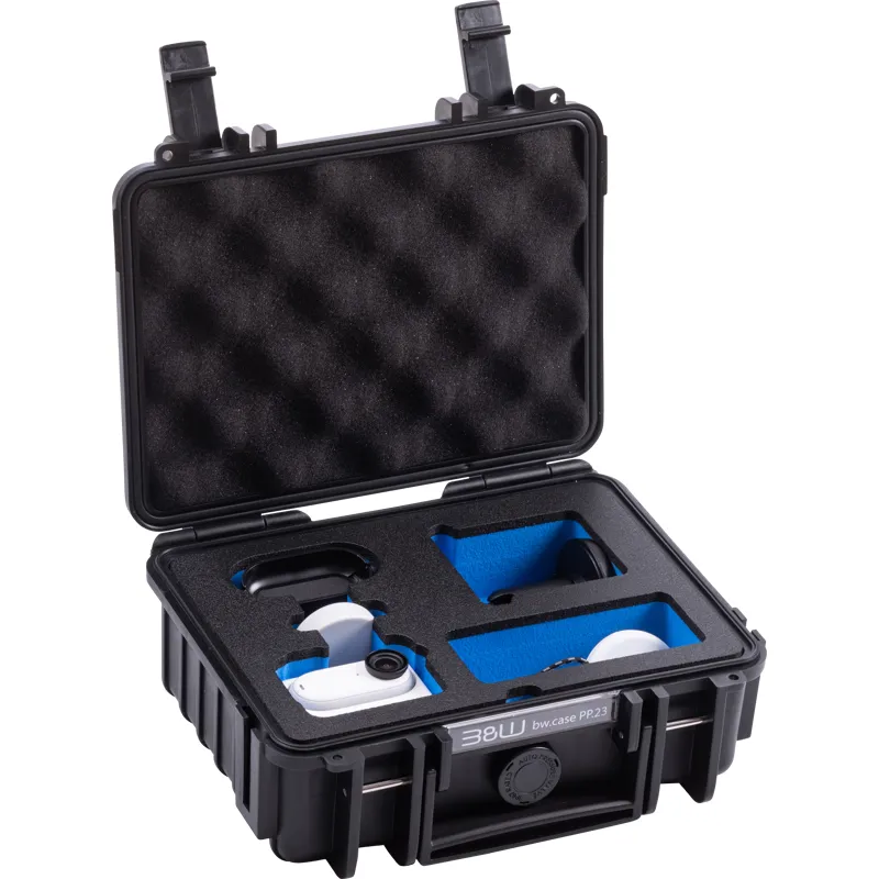 The outdoor.case 500, with a foam insert, accommodates the Insta360 GO3 or GO3S and additional accessories, providing optimal protection during transport.
