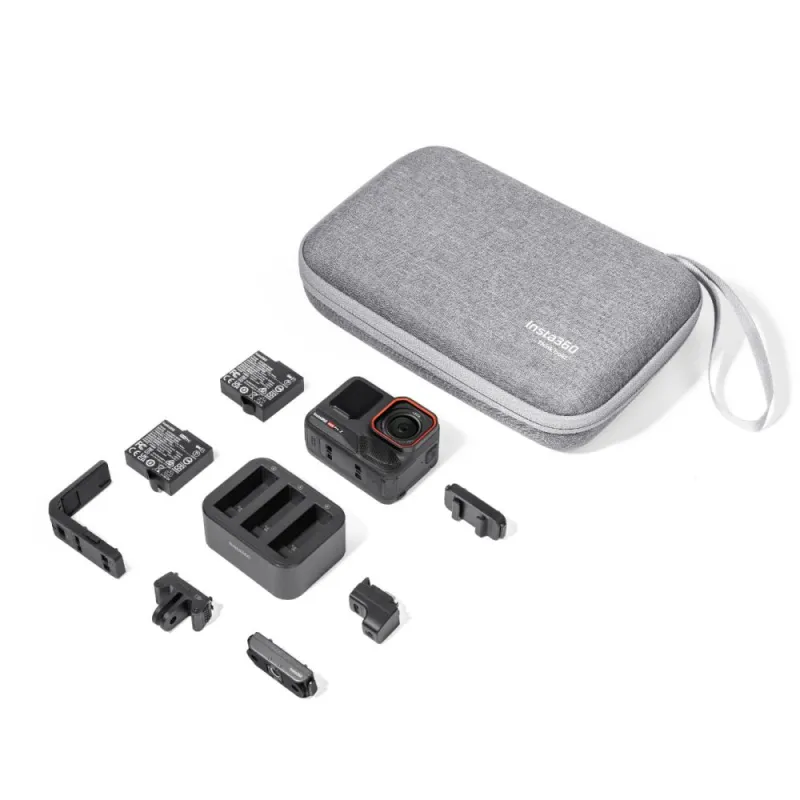 - Talpina jūsų Insta360 Ace Pro 2/Ace Pro/Ace, dvi baterijas, šaltą batų adapterį, greito atlaisvinimo tvirtinimą, greito įkrovimo centrą, mikrofono adapterį ir kitus priedus.
