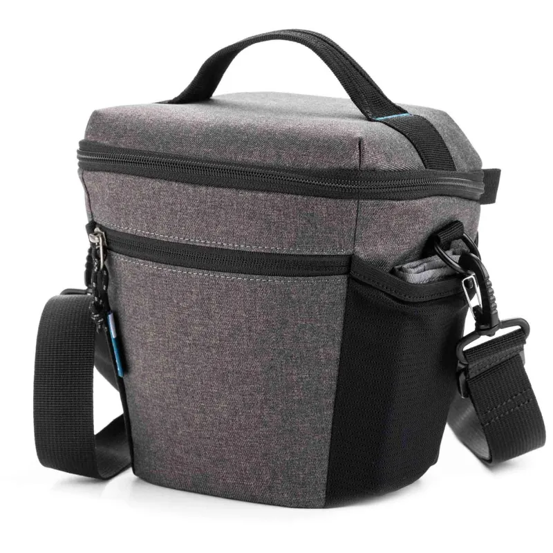 The gray Skyline V2 Top Load 8 Camera Bag from Tenba is designed to protect a mirrorless or DSLR with a lens up to 3.5" plus memory cards, batteries, and other accessories during storage and transport. The lid opens away from your body, so it won't interfere when you want to quickly remove your gear. This bag is made from water-repellent fabrics and features YKK zippers. The reinforced stitching ensures long-term durability. Expandable side mesh pockets stretch to hold water bottles or other accessories. The interior zippered pocket is ideal for storing memory cards and batteries.