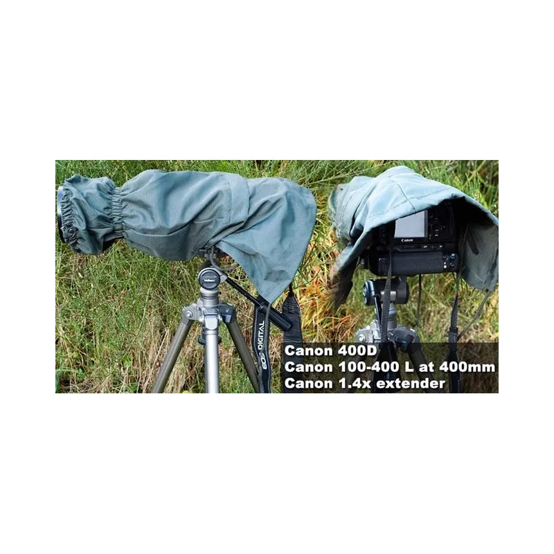 In emergency situations, the Extreme Gaiters can also be used as a rain cover. This can be done by attaching the ankle section around the end of the lens. An example of this is shown in the photo below: