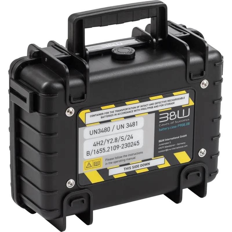 - Approved hazardous goods packaging per ADR P908 for transporting intact and defective lithium batteries.