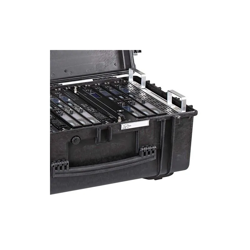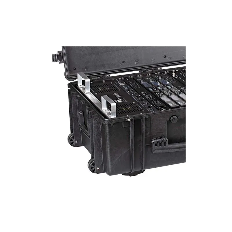 The Explorer Cases 7630.B.15U is a fully waterproof trolley case with an aluminum Rack Frame for 19" equipment. 19 Inch is a standardized width dimension for certain electronic equipment (see heading 'Application'). You can safely mount these devices in the rack using the 'slots' on both sides of the rack. The interior dimensions of the case are 76.5 x 48.5 x 30.5 cm; the exterior dimensions are 86 x 56 x 35.5 cm.