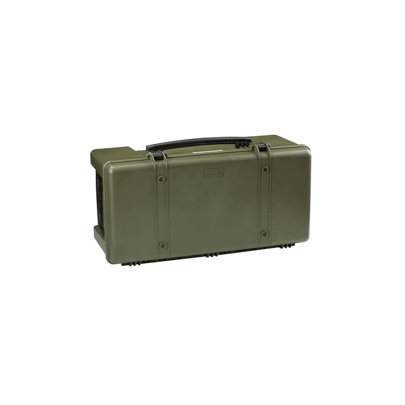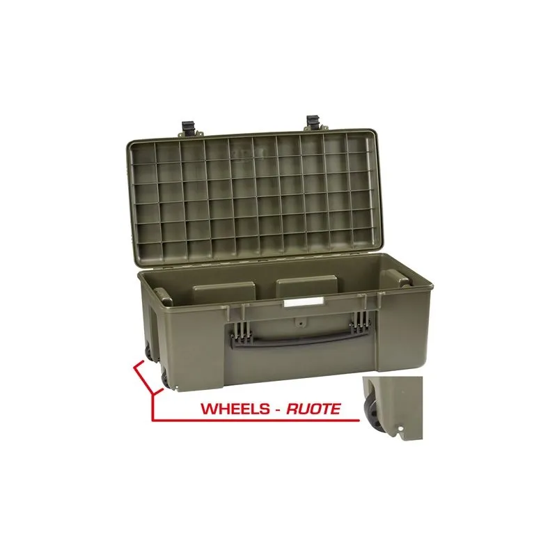 The MUB78.GE by the Italian Explorer Cases is a 78 cm long, waterproof multi utility box in the color Military Green. The universal case is lightweight and features wheels and an extendable handle. The MUB78 has internal dimensions of 780 x 410 x 330 mm and is therefore an ideal tool for transporting or storing (valuable) equipment.