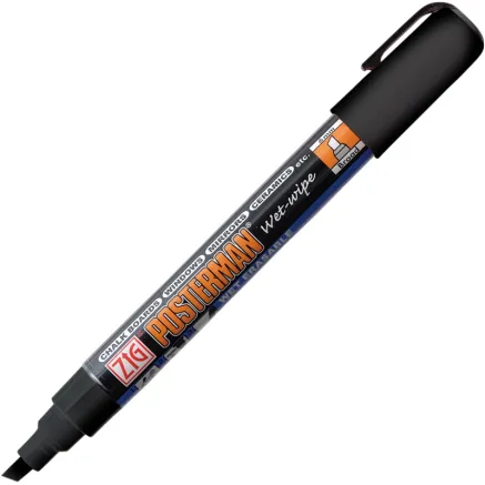 Posterman Wet-Wipe can be easily wiped off with a wet cloth and has a 6.0 mm medium cut tip. It is best suited for indoor use on blackboards/chalkboards, glass surfaces, and whiteboards. The result is similar to chalk, but without smudging; the text becomes waterproof once it has dried. This product is perfect for shops, restaurants, pubs, and more. You can write on windows, mirrors, ceramics, paper, glass, plastic, metal, wood, stone, and much more. Please note that it is not erasable on porous surfaces. Zig Posterman features a very opaque ink.