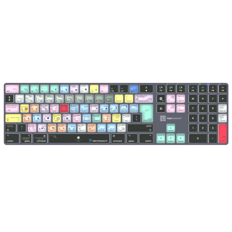 The Logickeyboard is the ultimate tool for editing in Photoshop, featuring labeled shortcut commands and color-coded definitions that enhance your workflow. Perfect for 3D modeling studios and professional graphics environments, it helps you master Photoshop quickly.