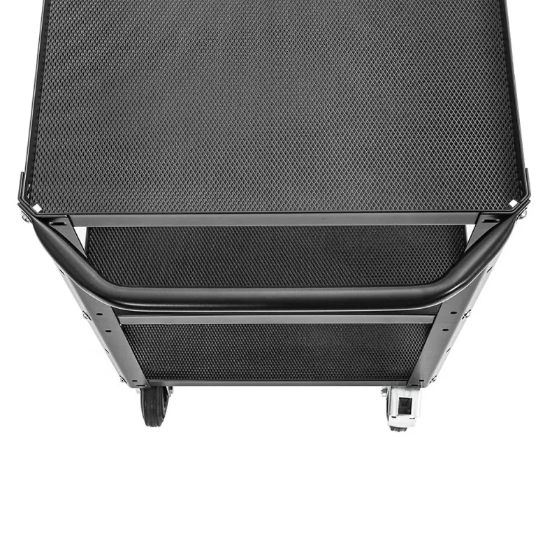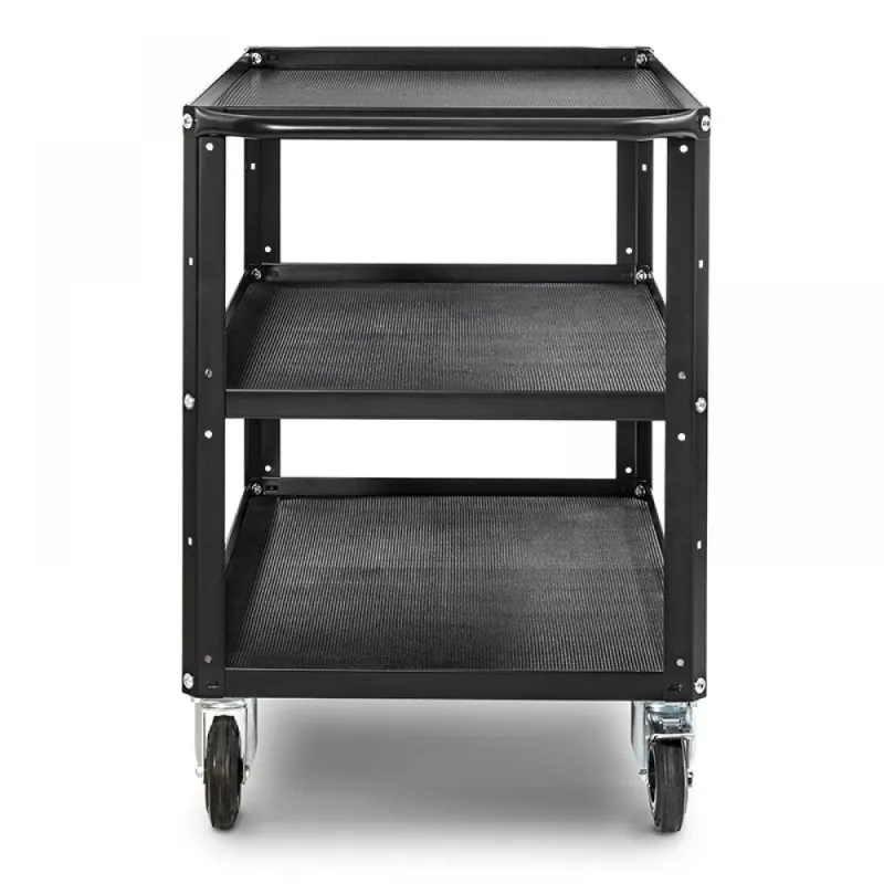 Three-shelf cart completely in black steel (RAL 9005). Large version.