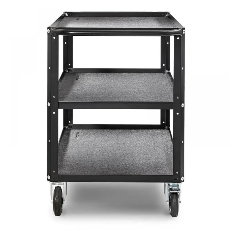 Three-shelf cart completely in black steel (RAL 9005). Large version.