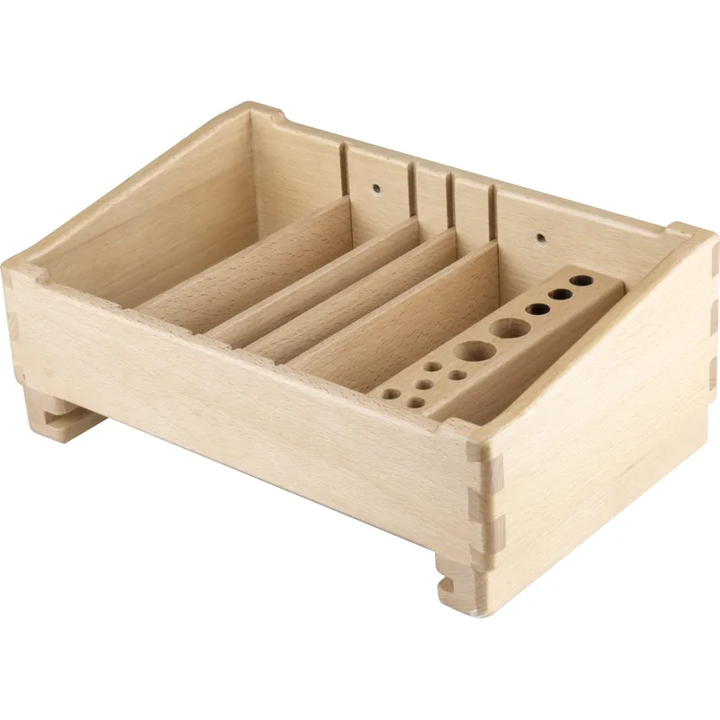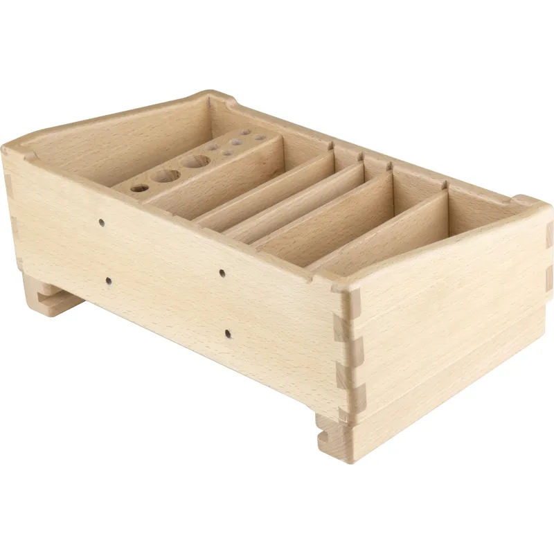 The Kupo Camera Assistant Front Box is made of high-quality European beech and comes with a natural finish. It features four removable and interchangeable dividers to customize your particular needs. The camera assistant front box also features a pen holder that is in a fixed position and includes variously sized holes for pens and essential cine tools. Slots on the underside of the front box conveniently hold a standard-sized slate movie clapboard.