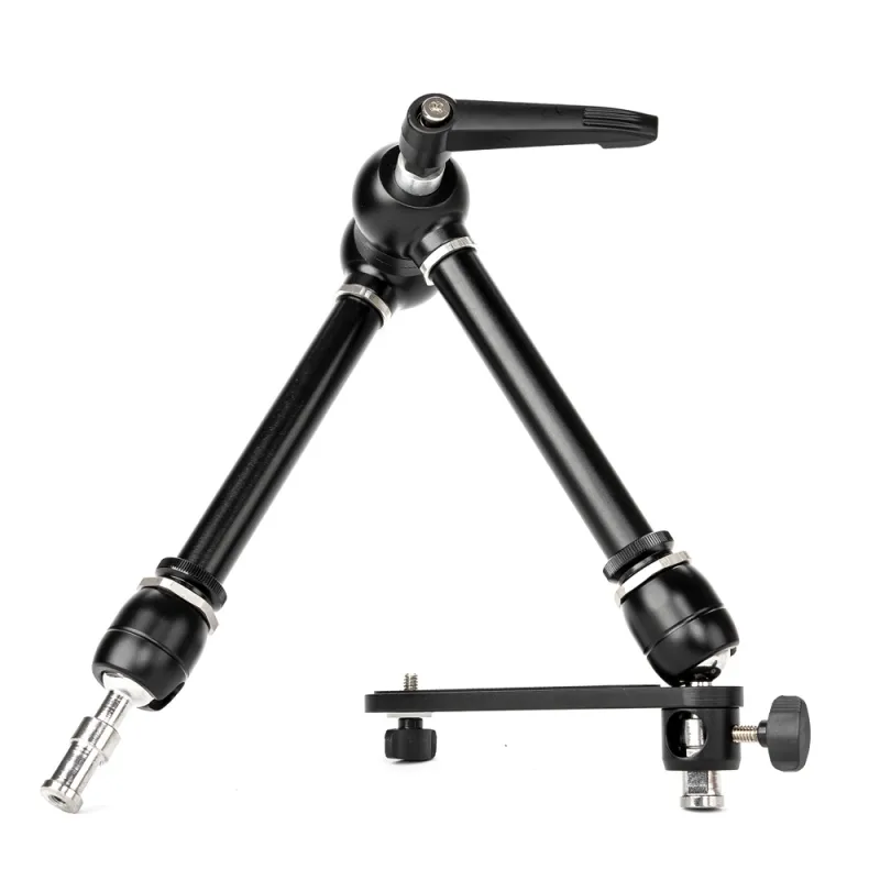 The fully adjustable arm it 360 degree rotatable and has a mini ball head provided with a 16mm spigot with 1/4" screw thread connections on both ends. The mini ball head has a 90 degree notch so you can easily switch between horizontal and vertical positioning. The magic arm is provided with a camera platform.