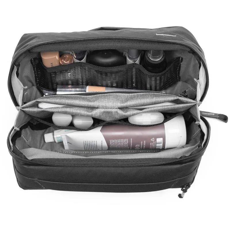 Designed for any trip, the Wash Pouch balances capacity and portability. It stands upright, features a stowable aluminum hook for hanging, and includes an exterior grab handle for quick access. For minimalist travelers, a smaller version is available, perfect for essentials like a toothbrush and deodorant.