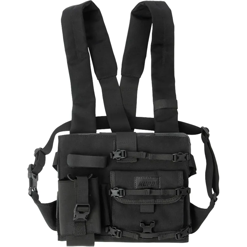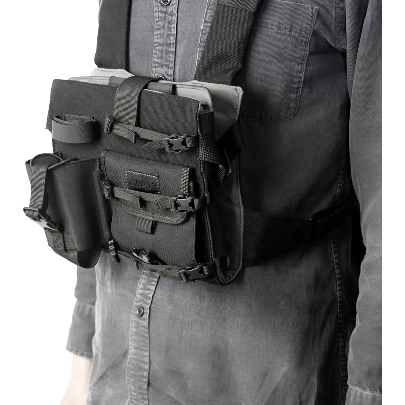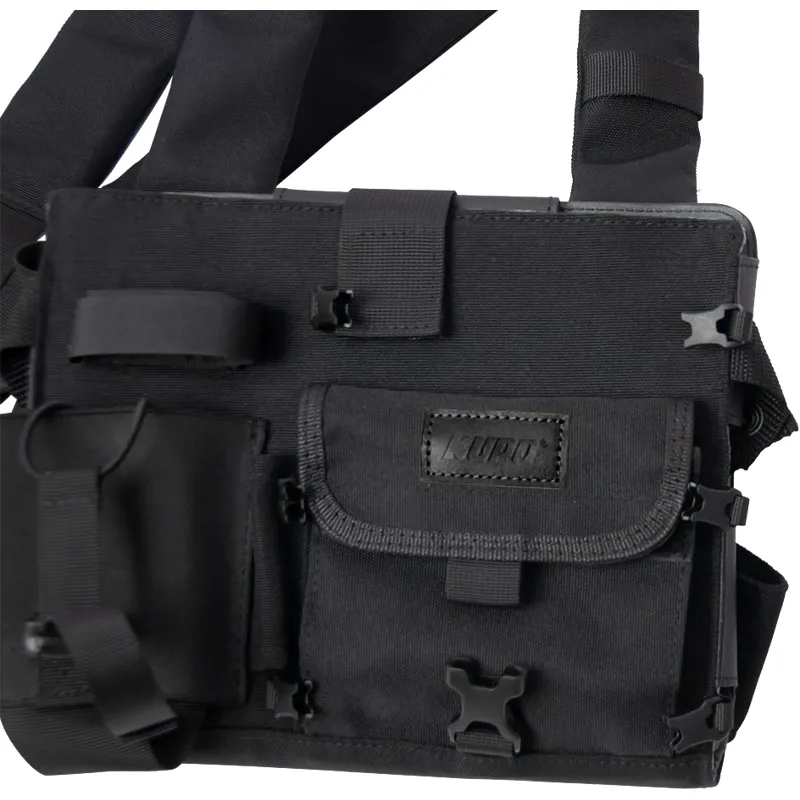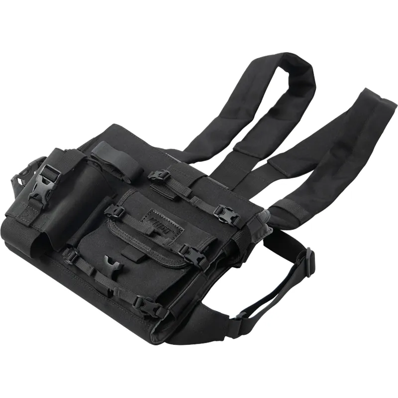 The Universal Radio Chest Pack is built entirely out of 1,680D Cordura nylon and features three pouches on the front, designed to carry a wide assortment of items. It is primarily intended for camera assistants in the film industry or anyone who needs rapid access to tools.