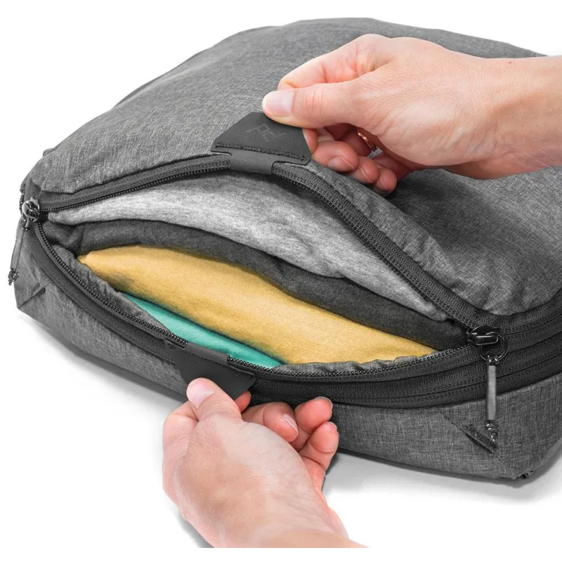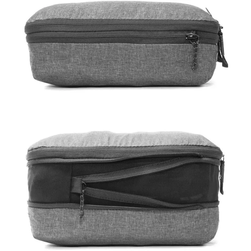 Peak Design Packing Cubes are compressible, easy to access, and instantly dividable, offering unmatched functionality and aesthetics. The unique tear-away zipper allows quick access to contents, unlike standard packing cubes. An internal divider separates clean and dirty clothes, while an expansion/compression zip provides extra space or compresses contents once packed. The outer shell is made of a durable, self-healing 70D nylon/poly blend.