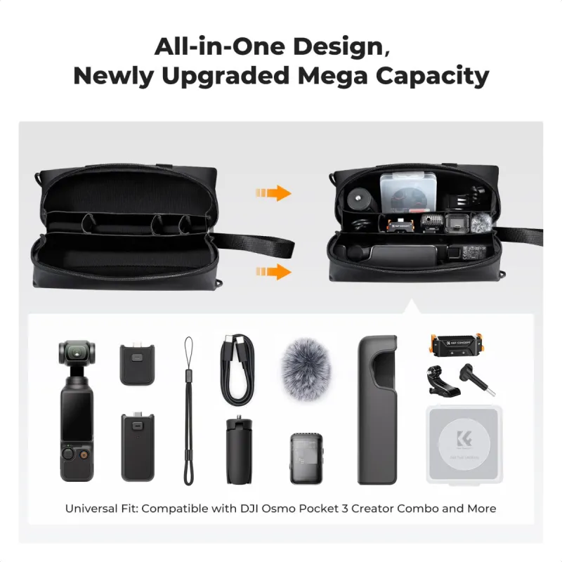 Pagaminta iš aukštos kokybės medžiagų, K&F Concept nešimo dėklas sujungia patvarumą su elegantišku, profesionaliu išvaizdu. Tai puikus palydovas, kad jūsų DJI Osmo Pocket 3 būtų saugus, kur tik nuves jūsų kūrybiškumas.