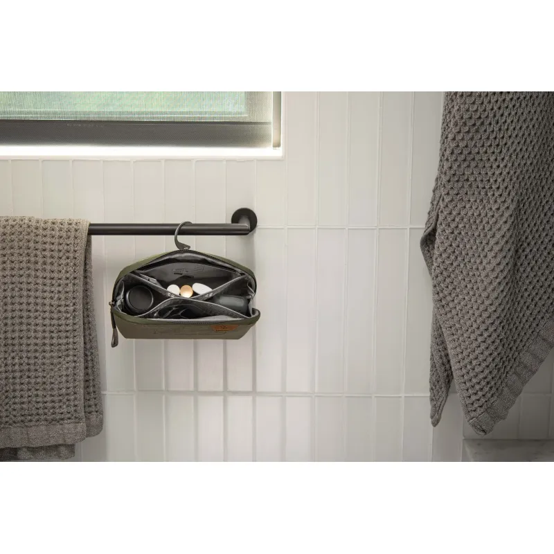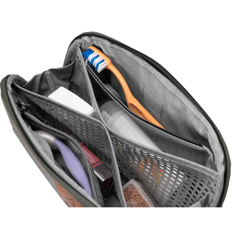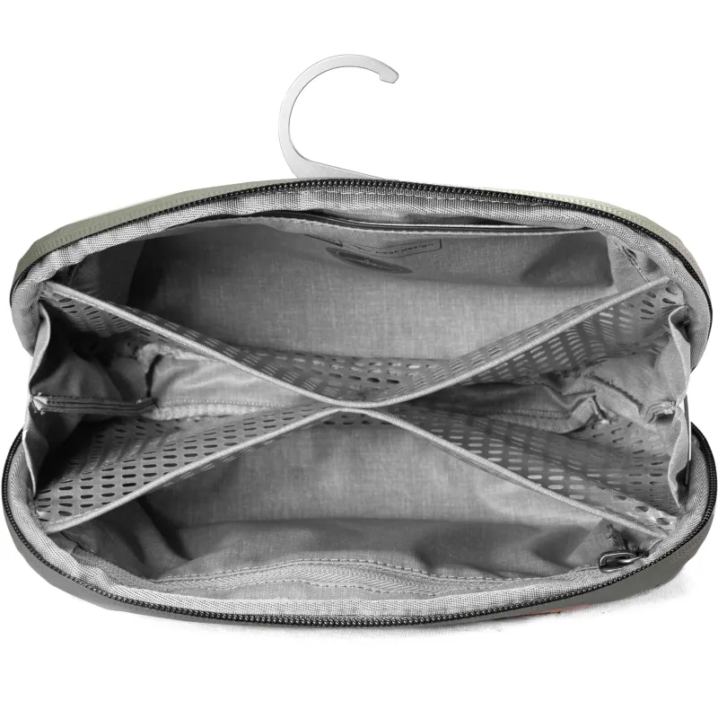 Durable, weatherproof, easy-to-clean materials repel water and stains so your pouch can take a beating and will still look sparkling clean for years to come. A burly #8 weatherproof UltraZip allows the bag to open wide, giving you total visibility and access to your items. The UltraZip can withstand decades of use thanks to it's proprietary abrasion-resistant thread. Sits upright on a counter or hangs via a stowable aluminum hook. 4 internal TPU-coated nylon mesh pockets, an internal zip pocket, and a magnetically-sealed toothbrush pocket keep items organized and clean. Plus, all pockets can turn inside out for deep cleaning in case of spills.