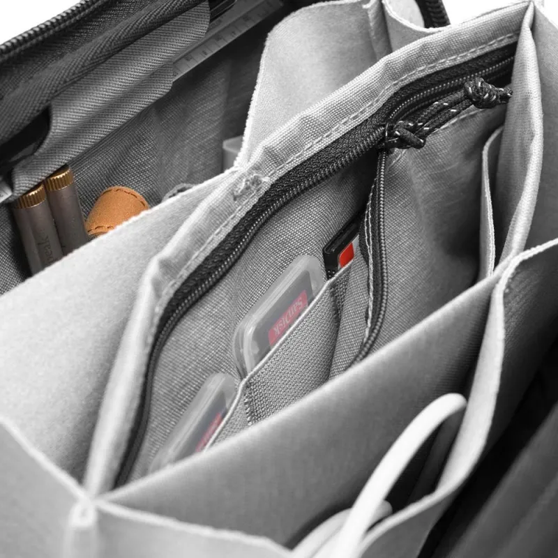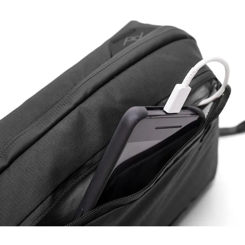 Exterior handles and a clamshell-style opening make this pouch a delight to hold and access. External zip pocket has a cable pass-through for easy device charging. The 200D recycled nylon canvas shell is weatherproof and aesthetically clean.