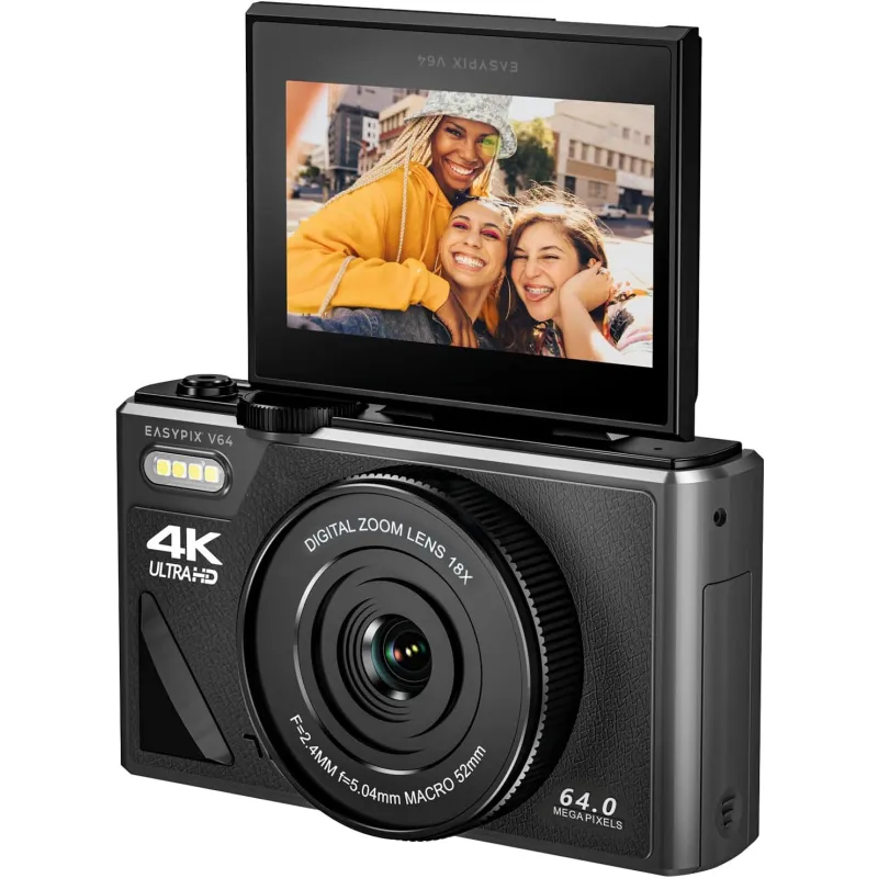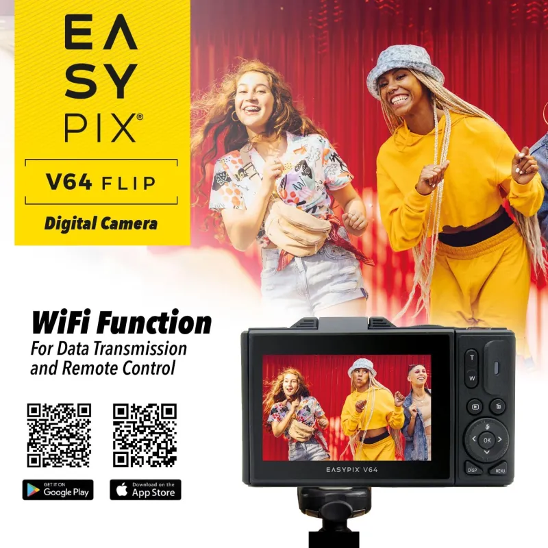 Ideali selfie ir vlogams, Easypix V64 Flip yra puiki skaitmeninė kamera tiems, kurie vertina lankstumą ir kūrybiškumą. Jos išskirtinė savybė yra 3 colių sulankstomas ekranas, kuris idealiai tinka selfie ir vlogams. Nesvarbu, ar fiksuojate spontaniškus kadrus, ar kuriate profesionalų turinį, V64 Flip suteikia įspūdingus rezultatus.