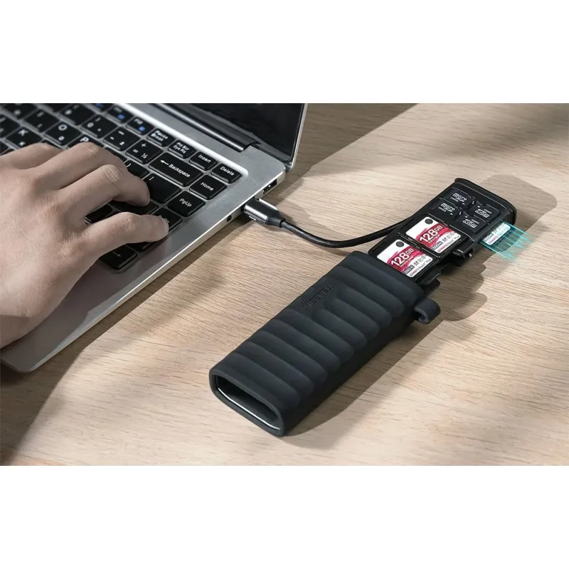 Telesin S6-MCR-01 kortelių skaitytuvas yra universalus įrenginys, kuris sujungia saugojimo, skaitymo ir rašymo funkcijas. Jis leidžia vienu metu skaityti dvi korteles - 1 SD ir 1 TF, taip pat saugiai laikyti 4 SD korteles, 6 TF korteles ir 2 Nano SIM korteles. Tai puikus pasirinkimas profesionalioms fotografijos ir vaizdo įrašų sesijoms! Jis taip pat išsiskiria plačia suderinamumu ir tvirtu dizainu su IP54 reitingu.
