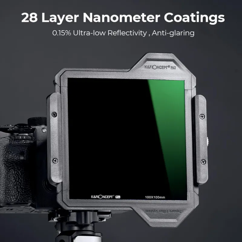 Full Color ND8 Square Filter provides 3 f-stops (0.9) light reductions, No Color Cast, and is equipped with Protective Frame. Using AGC optical glass with the double-sided 28-layer coating, anti-reflective Green Film can effectively reduce the surface reflection of the filter. Reduces glare caused by external reflections from long-exposure lenses, ensuring top-notch image quality.