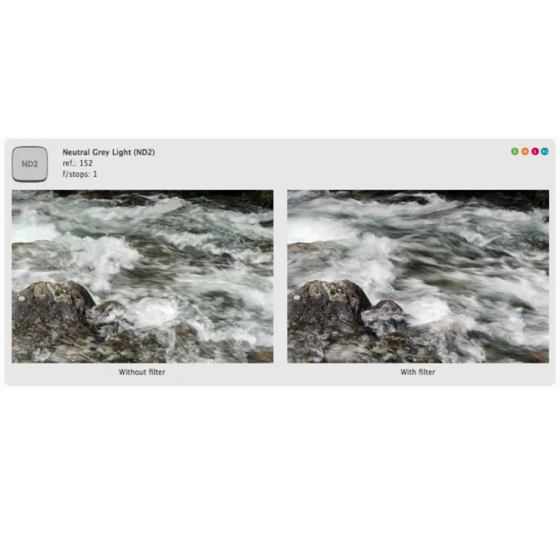 Neutral Density stands for Neutral density. Using this A152 Neutral Grey filter, you can achieve a longer exposure time than would be allowed by the film speed or sensitivity of your camera's sensor. Think for example of capturing flowing water. This filter reduces light by approximately one stop.