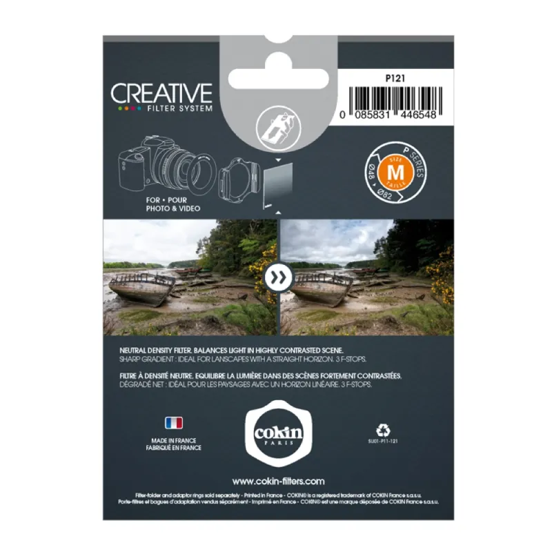 The Cokin Filter P121 Graduated Grey G2 ND8 (0.9) produces a neutral grey gradient effect and can be used to reduce light passing through the lens onto the sensor, giving you more control over exposure and depth of field without affecting colour. Cokin filters are made of organic glass and ensure optimal light transmission for high image quality. The filters are extremely lightweight and are highly resistant to shocks and drops. The filter measures 85x85mm and is compatible with the Cokin P filter holder.