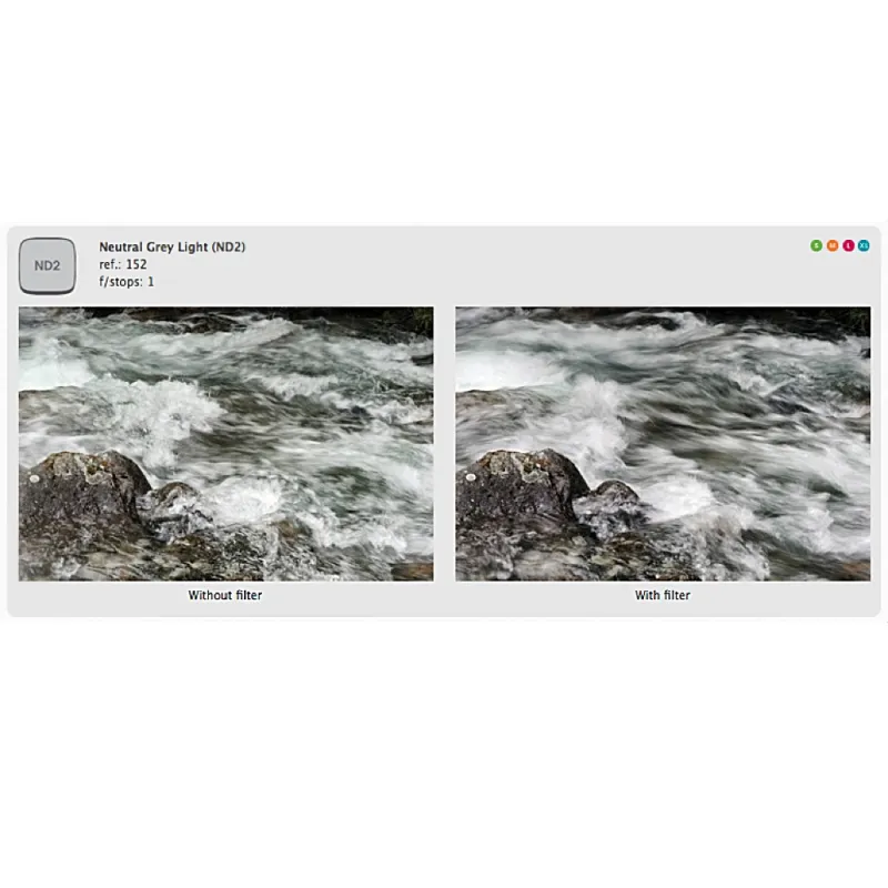 Neutral Density stands for Neutral density. Using this Z152 Neutral Grey filter, you can achieve a longer exposure time than would be allowed by the film speed or sensitivity of your camera's sensor. Think for example of capturing flowing water. This filter reduces light by about one stop.