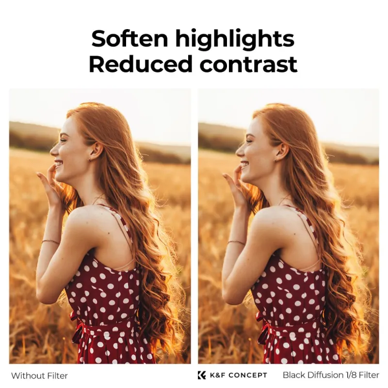 - * Creats Dream Cinematic Effect This black diffusion 1/8 effect filter could soften the wrinkles, freckles and pores of facial skin, making it more delicate, plump and gorgeous. The hazy film effect can be better realized, showing dreamily effect. Reconmending use it in video shooting and portrait photography.