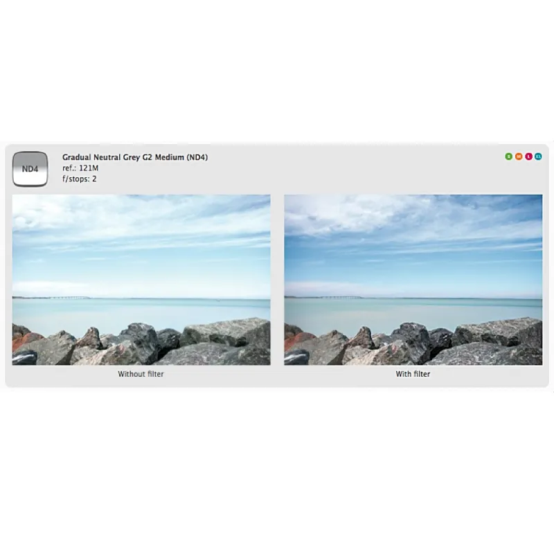 The lower half of the filter is transparent with a transition to the ND effect in the upper half of the filter. The X121M ND filter is colour neutral and gives you more exposure options when you are shooting skyline or landscape. The length of the filter allows you to position the effect precisely in the filter holder. No more skies without detail!