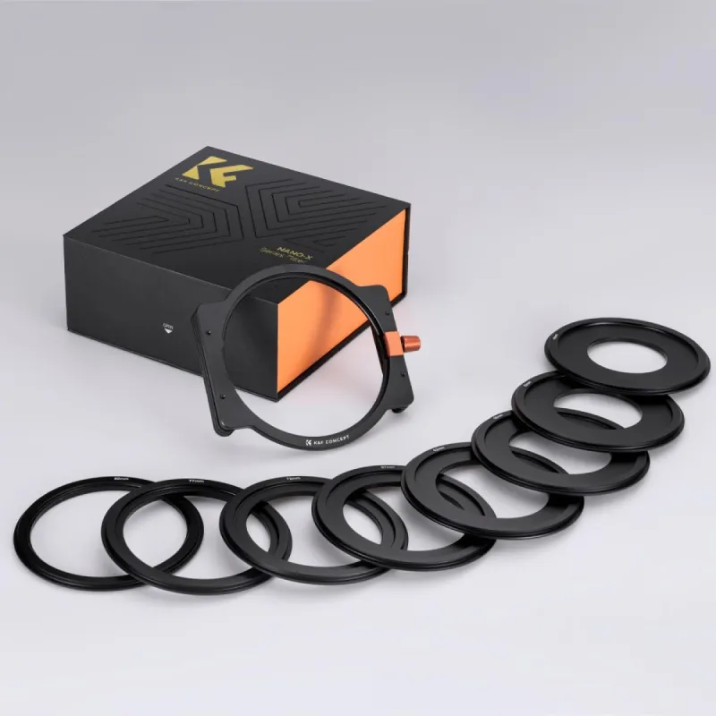 Experience photography with precision and quality using our 100mm filter holder, meticulously crafted from aviation-grade aluminum through CNC integrated processing and finished with a durable black matte oxidation. All the nuts within the bracket are constructed from copper and black nickel-plated for increased longevity while minimizing the impact of stray light on your imaging. The kit includes 8 adapter rings (49/52/58/62/67/72/77/82 MM) to perfectly accommodate your lenses. The 100mm all-aluminum bracket boasts a lightweight design at approximately 77g and a slim frame measuring about 9mm in thickness, making it ideal for wide-angle lenses with a focal length greater than 18mm. Its front-facing connection to the camera lens is complemented by an arc-shaped overall structure, featuring convenient clips on the protruding sides and a button/slider combination for secure positioning.
