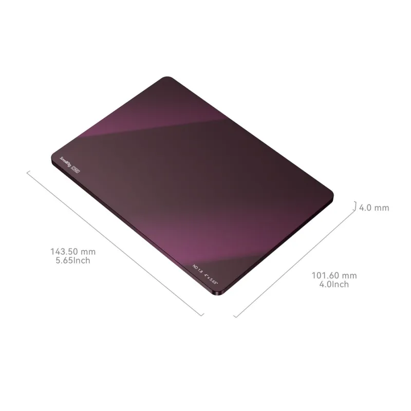 SmallRig 4 x 5.65" ND1.8(6 Stops)Filter 4227 is one of the CINE ND filters designed for professional photographers. It features 1.56% light transmittance, with six stops of light extinction, and optical glass, precisely ground and polished for use with a 4 x 5.65" filter tray or matte box. Made of high-clarity, high-transmission B270 optical glass from Germany, this filter is coated on both sides with multilayer nano-coating to ensure high-accuracy color reproduction. These coatings are mildew-proof, waterproof, oil-resistant, and anti-scratch, making the item easy to clean and store, and ideal for use in video or film shooting. The filter allows for a wider aperture for added blur of the background and control of image sharpness, thereby improving latitude and image quality.