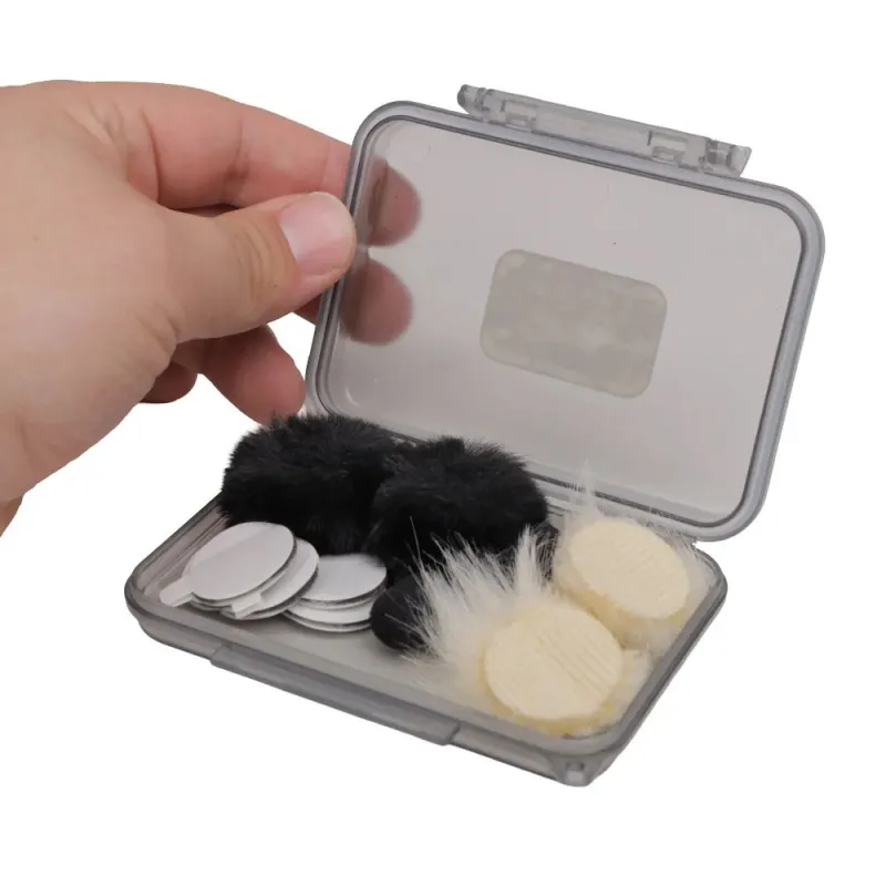 The two included foam windscreens have been upgraded to feature a rubber gasket that keeps them snugly in place and prevents them from slipping on the lavalier head. The five disposable adhesive disks are designed to be used with the two pieces of faux fur to create a seal around the lavalier head. The two black fluff balls are included in case you need even more wind protection.