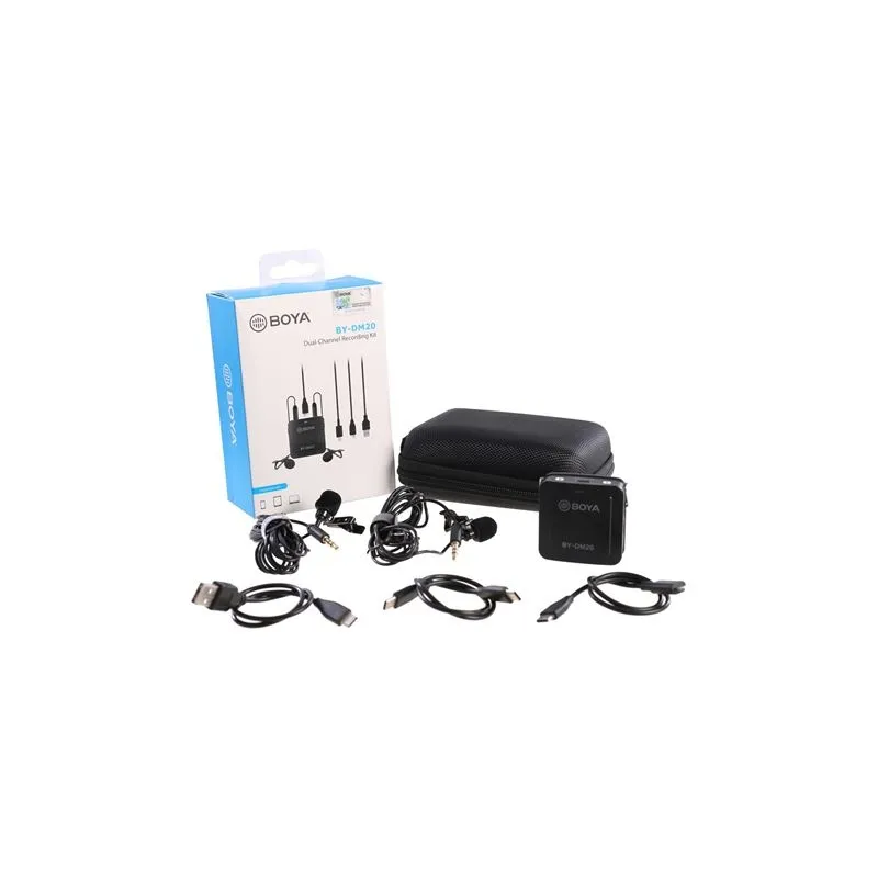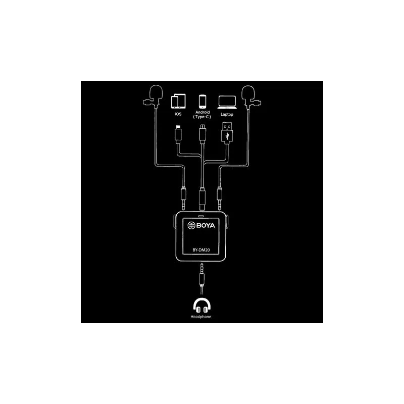 The Boya BY-DM20 is a duo lavalier microphone, suitable for iOS, Android (usb-c), PCs and laptops. You can connect the BY-DM20 to your device using the included Lightning cable, USB-c cable or USB-a cable. The two supplied lavalier microphones can be connected to the BY-DM20 using the 3.5 mm cable.
