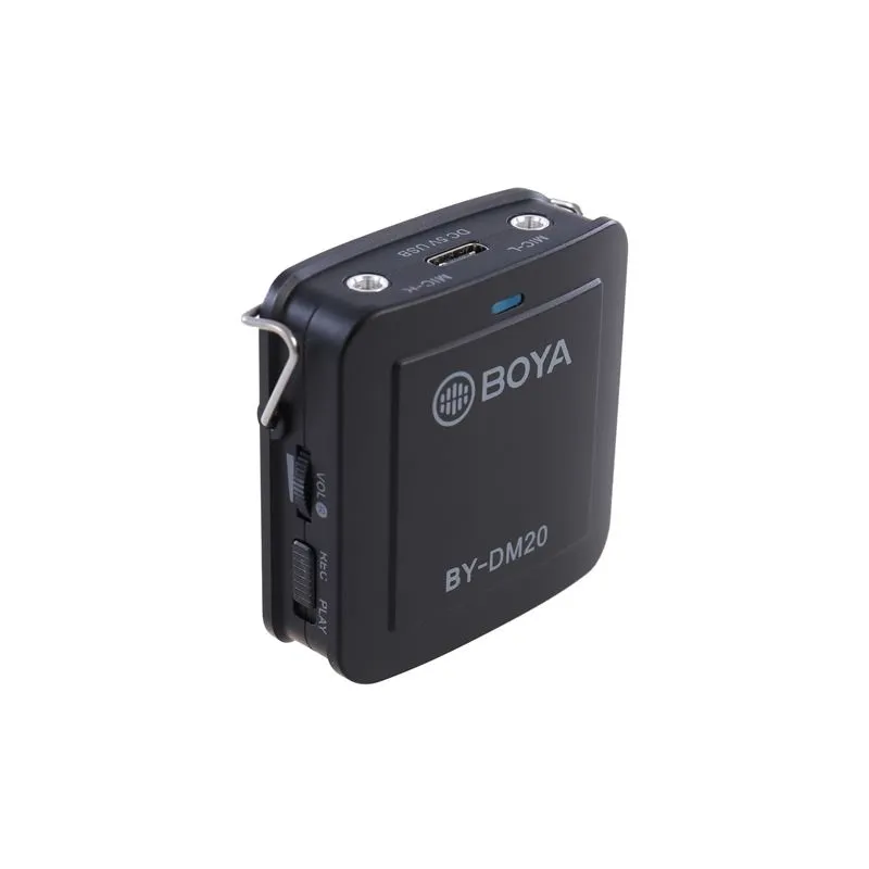 For both channels you can adjust the volume yourself by means of the rotary knob. There is a button that allows you to switch between stereo or mono, depending on the use of one or two microphones. While recording, you can listen live by connecting headphones or earplugs to the special 3.5 mm output. It is also possible to replay a recording afterwards. To do this, play back the recording on your device and slide the special button on the BY-DM20 from 'REC' to 'PLAY'.
