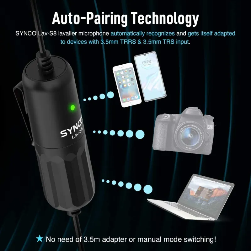 Featuring with auto-identification, SYNCO Lav-S8 lavalier microphone automatically recognizes and gets itself adapted to devices with 3.5mm TRRS & 3.5mm TRS input. No need of 3.5m adapter or manual mode switching!