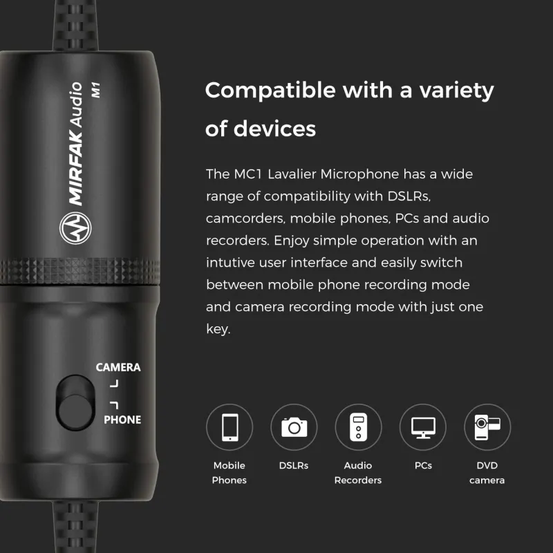 The MIRFAK Lavalier Microphone MC1 has a wide range of compatibility with DSLRs, camcorders, mobile phones, PCs and audio recorders.