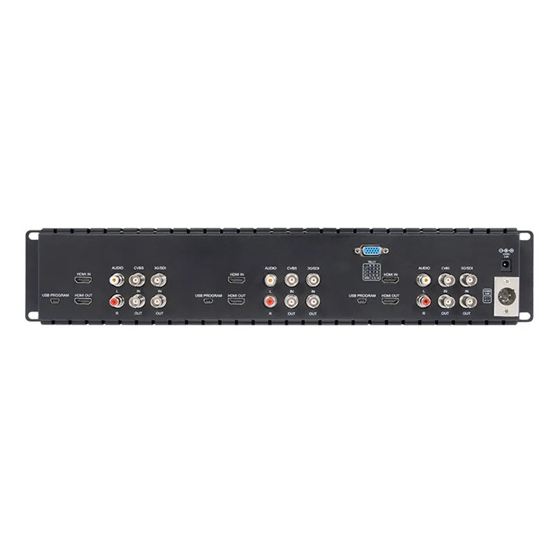The Feelworld T51 is an ultra-thin 3G-SDI/HDMI 3 RU rackmount monitor with GPIO network control designed for efficient broadcast monitoring of up to 3 1080p60 signals. The D71 has 3G-SDI, HDMI and composite BNC inputs and outputs per screen, as well as RCA audio inputs for each panel.